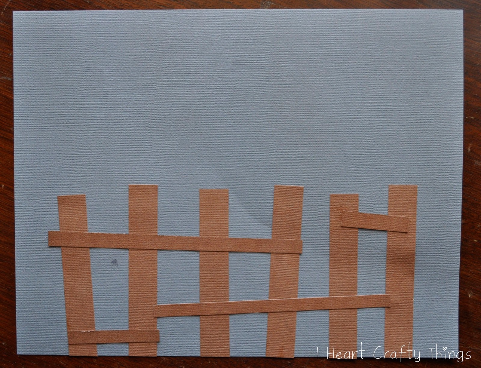 1. Start by cutting strips from your brown paper to make fence posts. Glue them onto the bottom of your grey piece of cardstock paper to make the old fence.