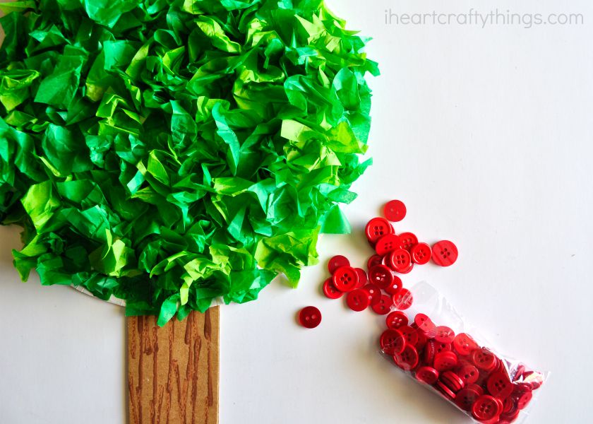 4. Get out your red buttons and glue them all over your tree to make apples.