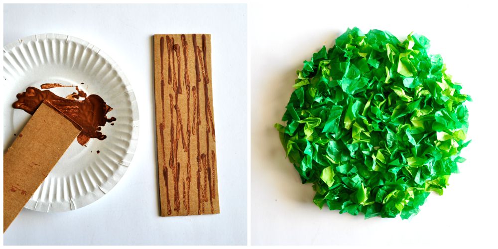1. Start by cutting a rectangle out of your cardboard for your tree trunk. Cut another small section out to use as a stamp to make texture onto your tree trunk. Pour a small amount of brown paint onto a paper plate and using the end of the extra cardboard piece, dip it into the brown paint and then onto your cardboard trunk. Make lines up and down your trunk. (As an alternative and to save time, you could also use a brown marker to make the lines on the tree trunk.)