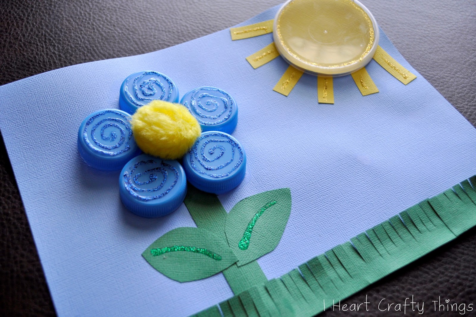 I used the milk caps for the flower petals and a large yellow pom-pom for the center of the flower. The sun is made out of a Pringles lid. I cut a yellow circle that would fit inside the lid and glued it inside of it. The sun rays are strips of yellow paper and the flower stem, leaves and grass are cut out of green paper. I cut and frayed the strips of green paper for the grass before gluing them down. The glitter glue gave it some much needed pizazz.