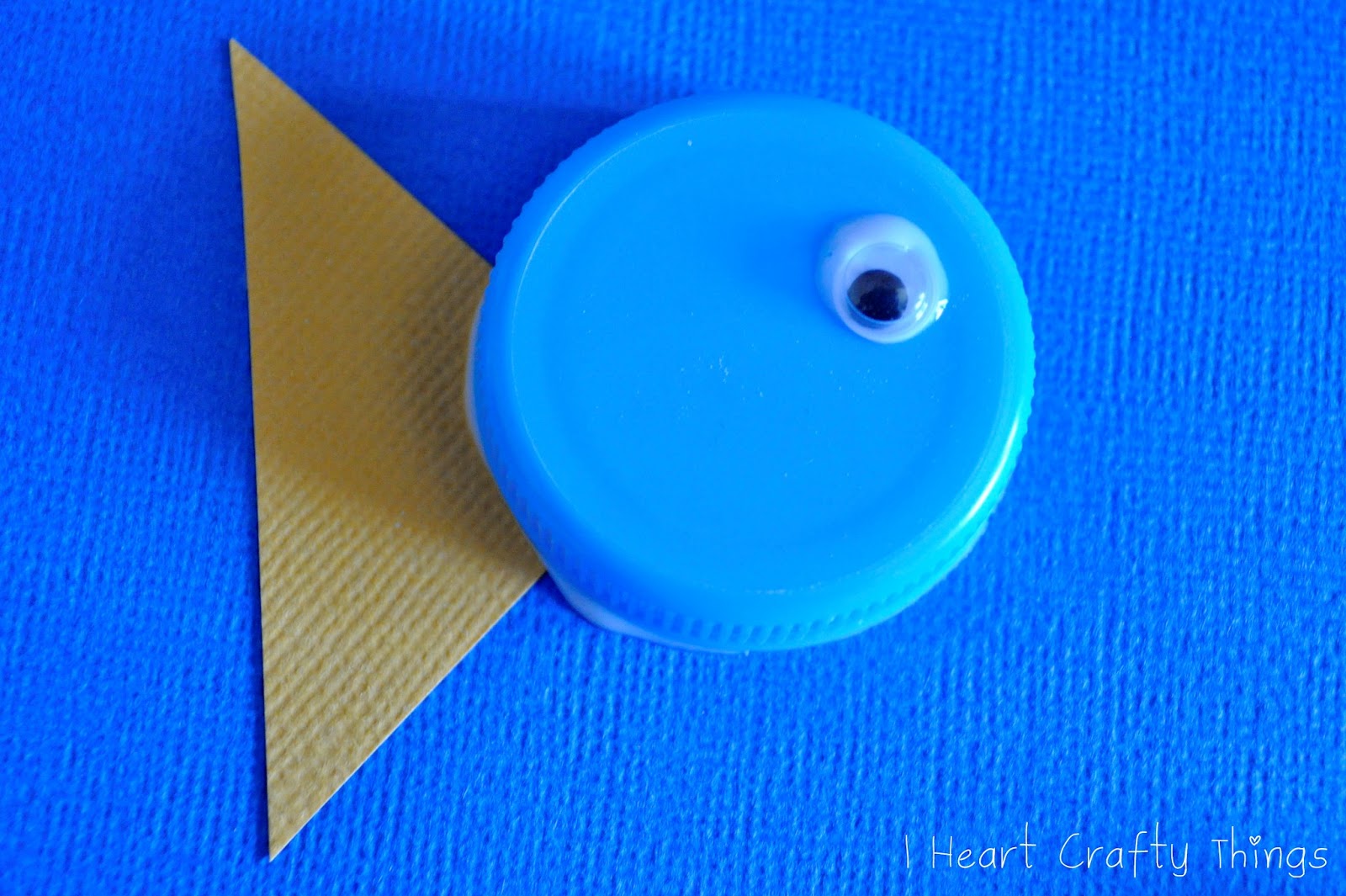 3. To make the scales on our fish, we used fun Rainbow Glitter Glue from Craftprojectideas.com. They come in little tubes that are easily handled by little hands and the glitter dries raised. I LOVE using glitter glue because it gives the same effect as traditional glitter, but without all the mess. Make scales on the bottle cap and also lines to define the tail fin. The variety of colors made this extra fun for the kids.