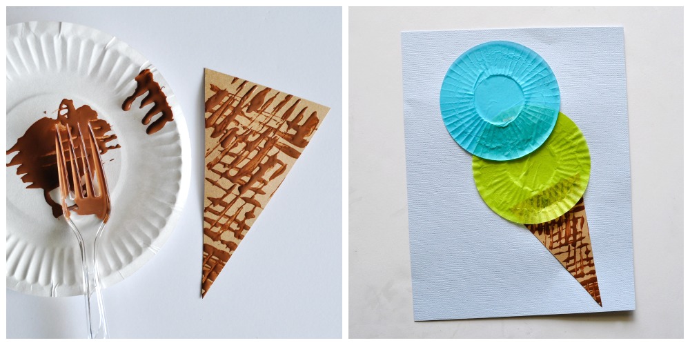 1. Start by cutting a triangle ice cream cone shape out of your light brown cardstock paper. Pour a small amount of brown paint onto your small paper plate and dip your fork into it lightly and then onto your cone. Make lines in both directions to resemble the pattern on an ice cream cone. Set it aside to dry completely.
