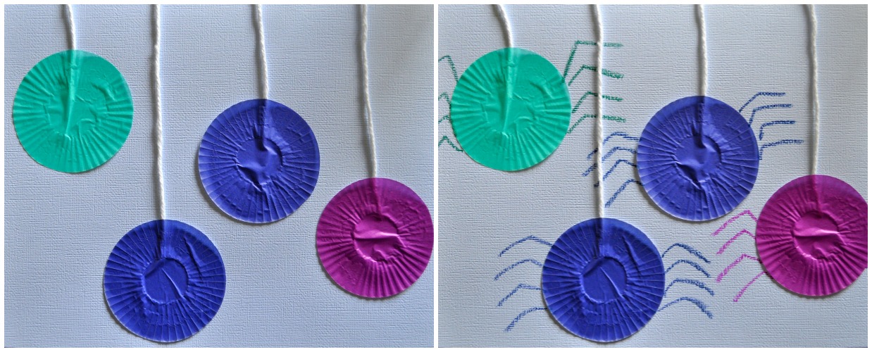 1. Start by gluing your mini cupcake liners onto your cardstock paper with a piece of white string coming out the top of it.