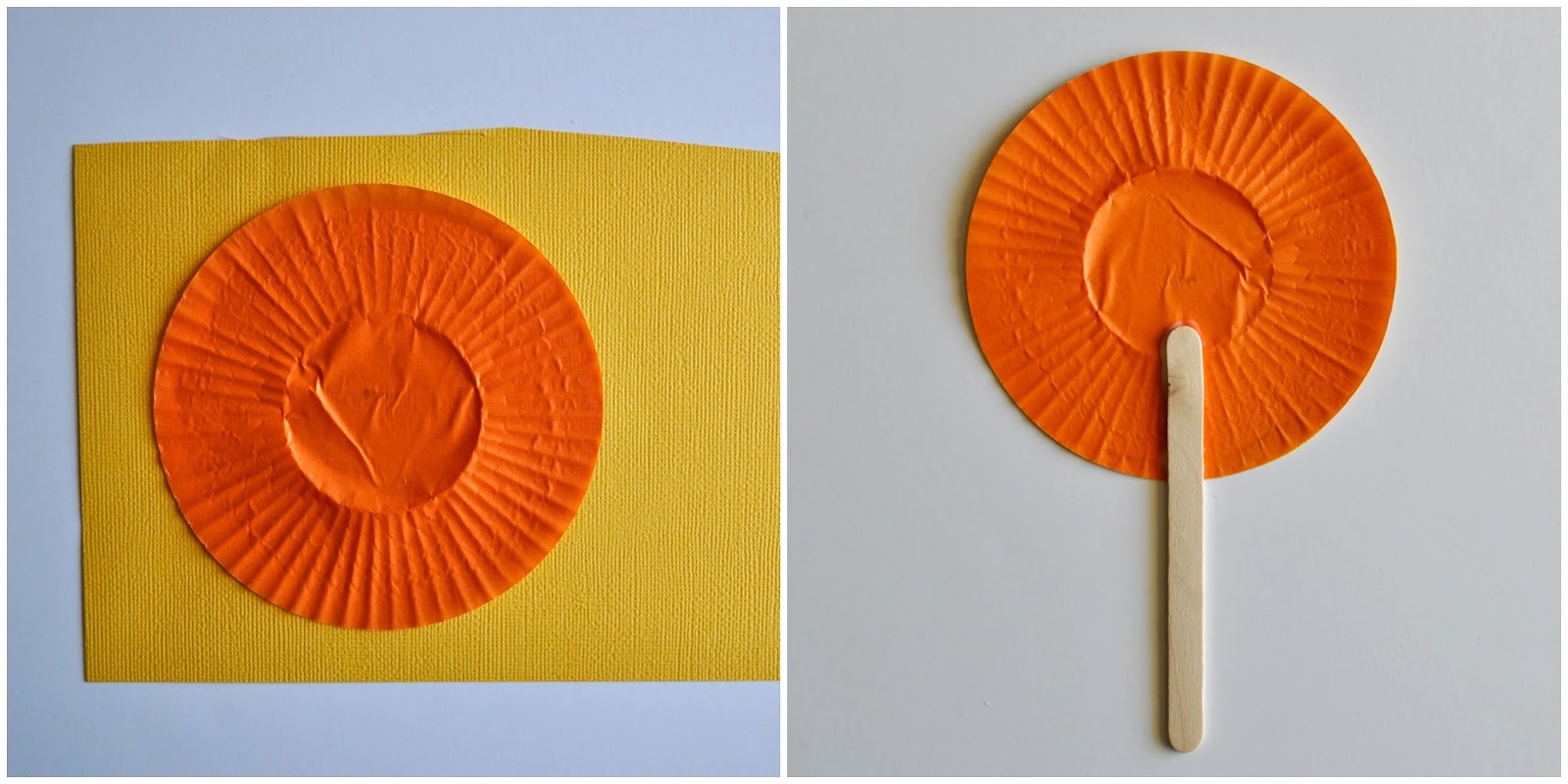 1. Start by using your glue stick to glue down your orange cupcake liner onto a sheet of cardstock paper. I used a scrap piece of yellow that I had. You can choose whatever color you want to use. Now cut the cupcake liner out. (Backing it with cardstock paper gives the cupcake liner and puppet stability.)