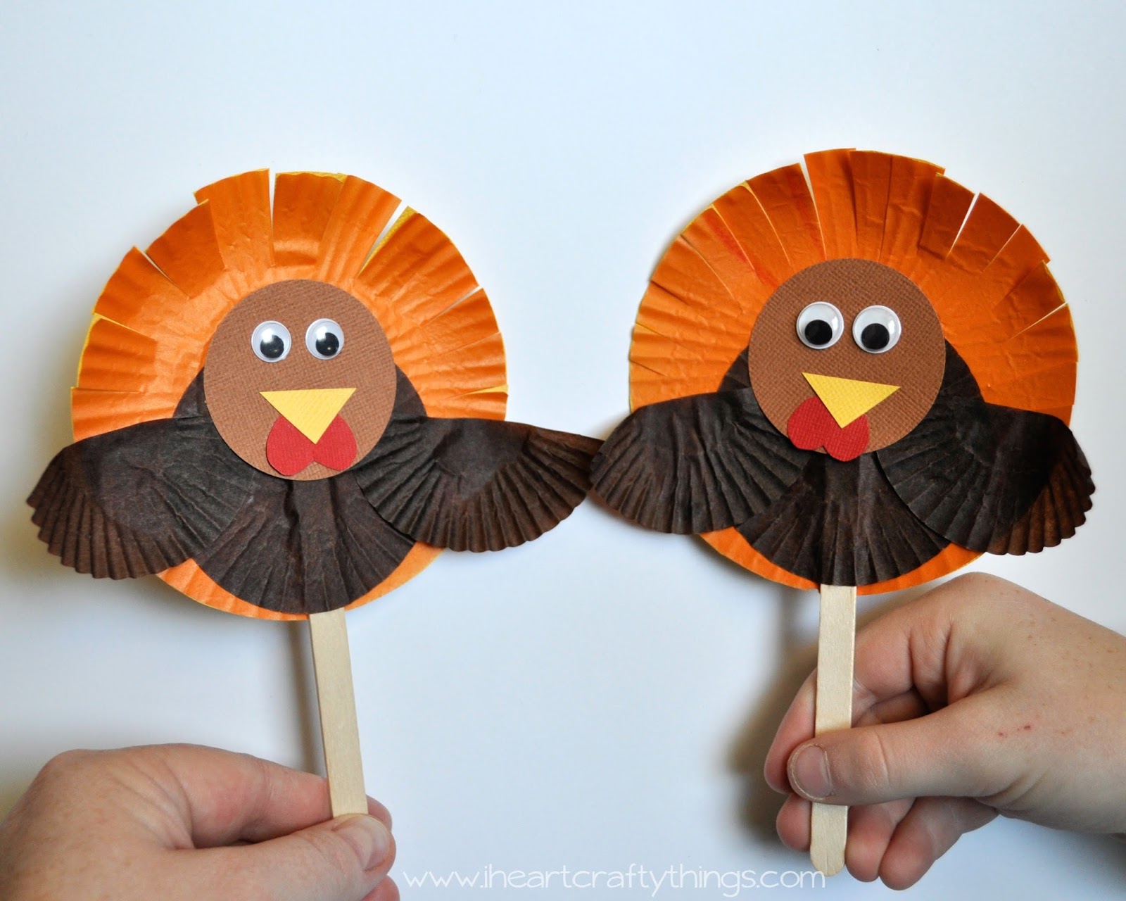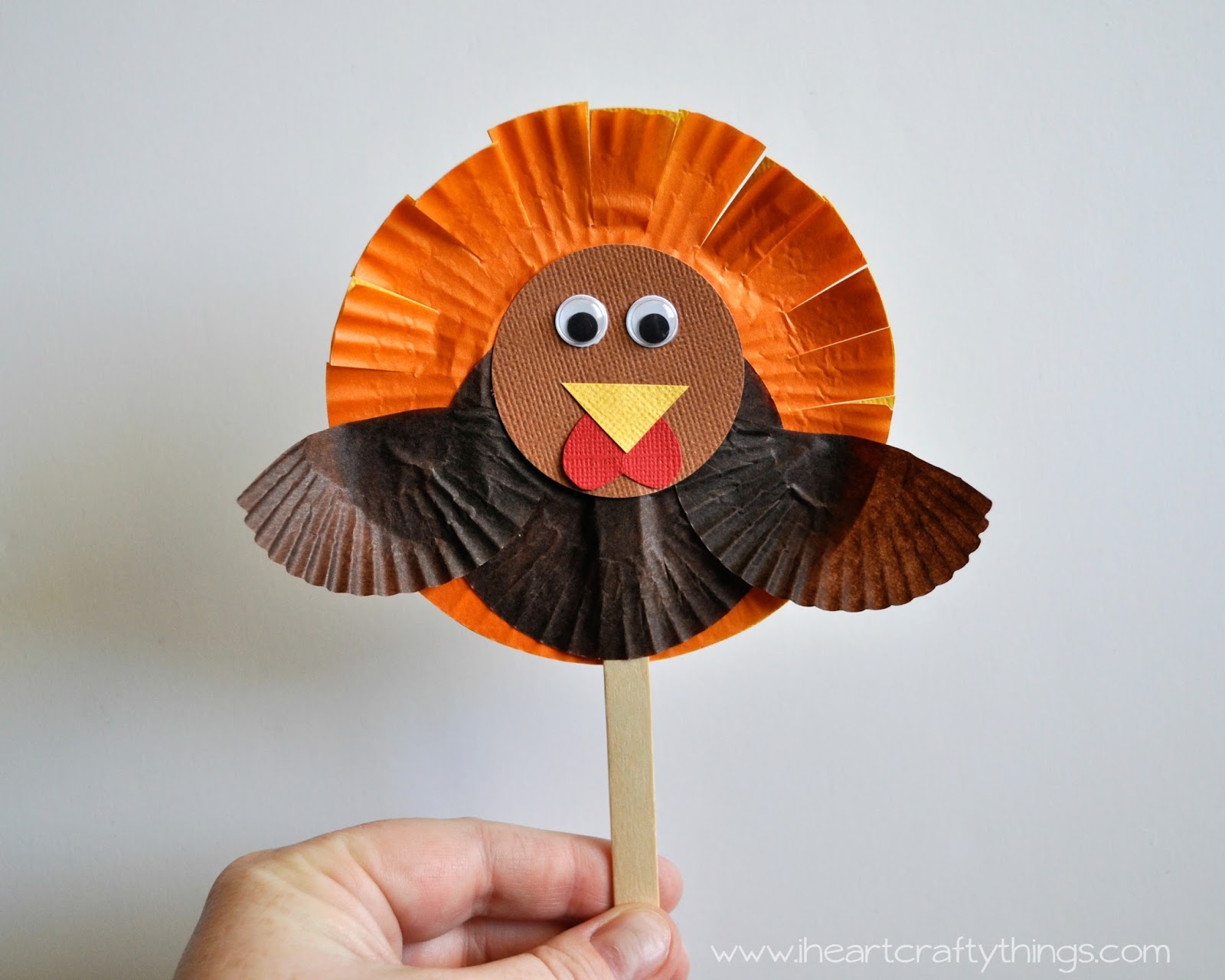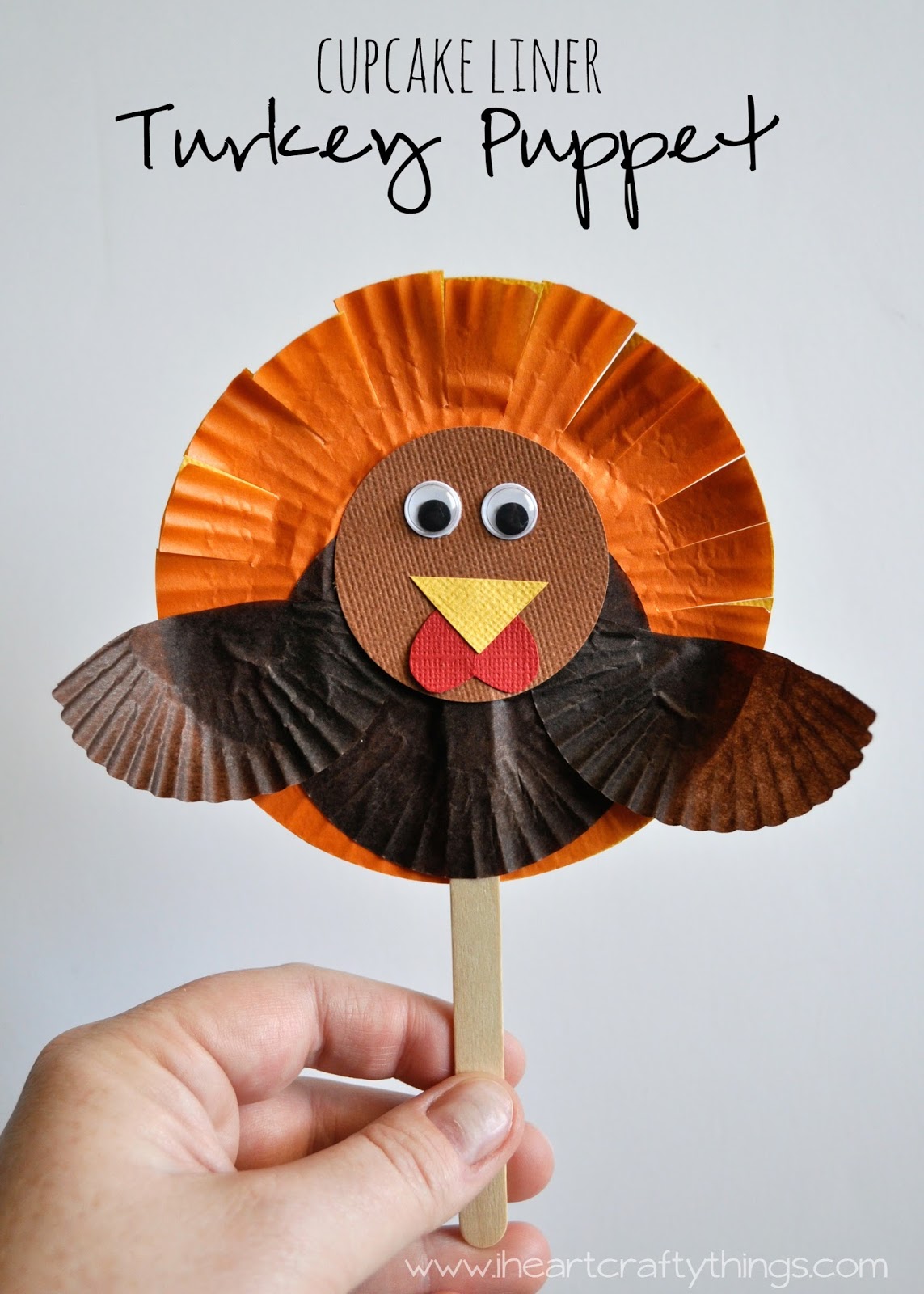 Now you have a fun little turkey puppet to reenact your favorite turkey story or for imaginative, pretend play. We made several turkeys so my kids have had fun letting them interact with each other. I think it would also be fun to play around with different patterned cupcake liners instead of the orange one. I’m thinking orange polka-dot liners