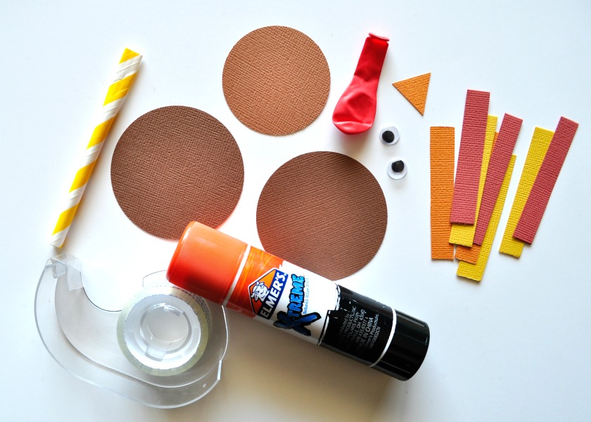 1. Start by gathering your supplies. For each turkey cupcake topper you will need to punch out two 3-inch circles in brown, one 2-inch circle in brown, an orange beak and small strips in red, orange and yellow. You’ll also need half of a yellow paper straw with an inch on the end of it flattened.
