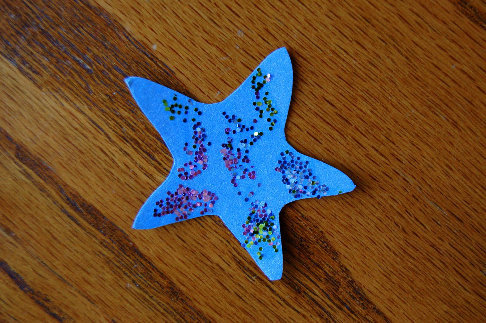 I cut the sea star shape out of blue card stock paper, then my son added some glue and sprinkled glitter on him to make him more colorful.