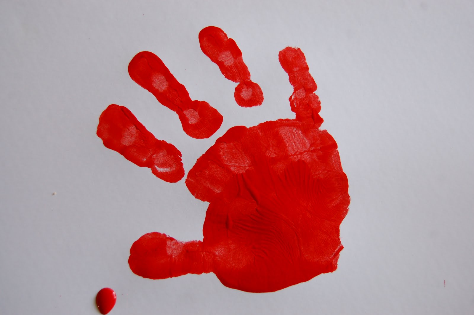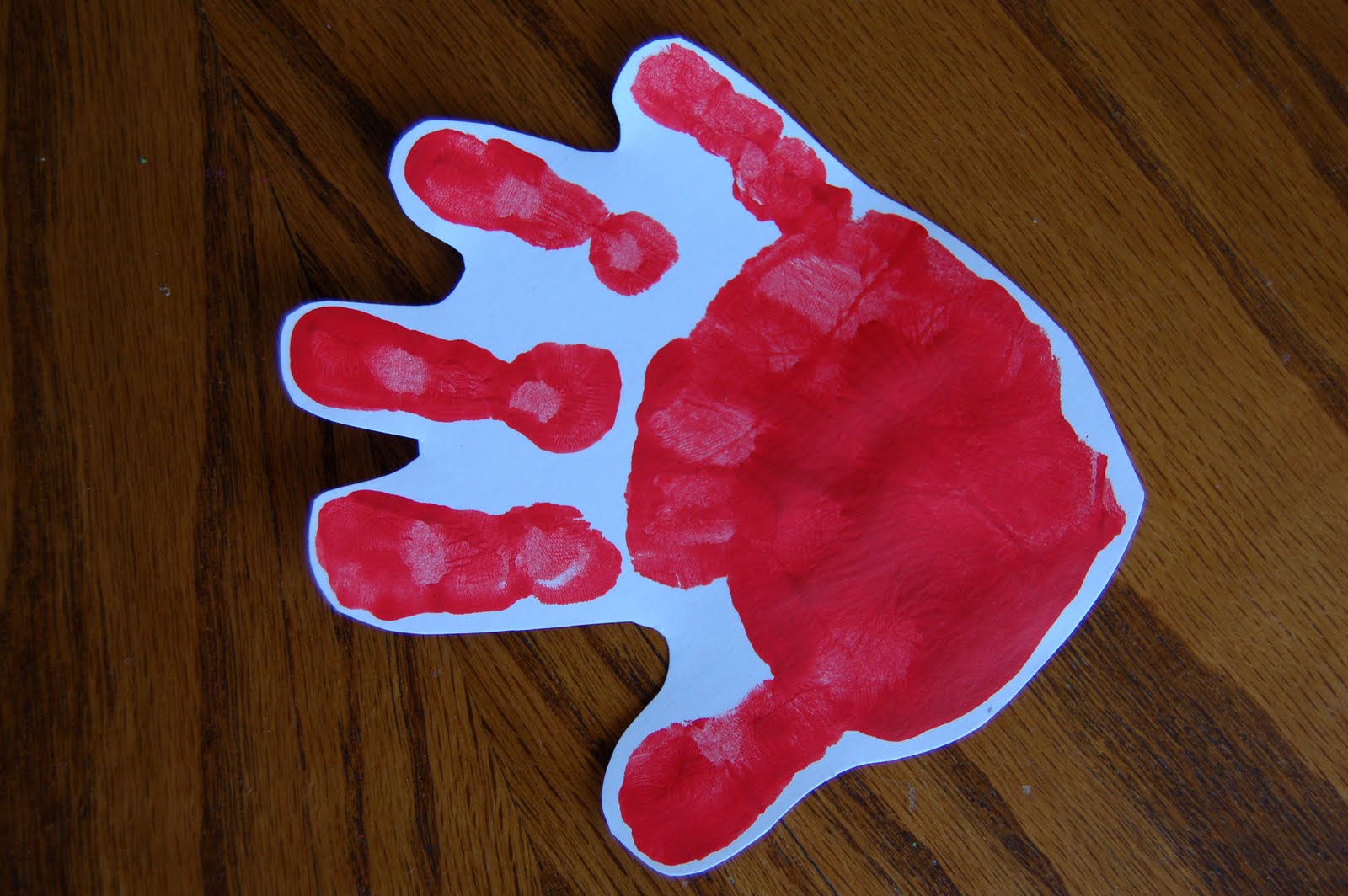 1. Cover your child’s right hand in red paint and press it onto a piece of white card stock paper. This creates the crab body.