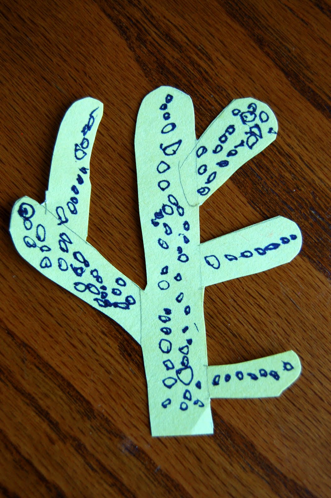 12. Lastly, I cut out a sea urchin using a scrap piece of cardboard paper I had and Andy used marker to add some brown and black to him. Attach him to your paper and your masterpiece is complete.