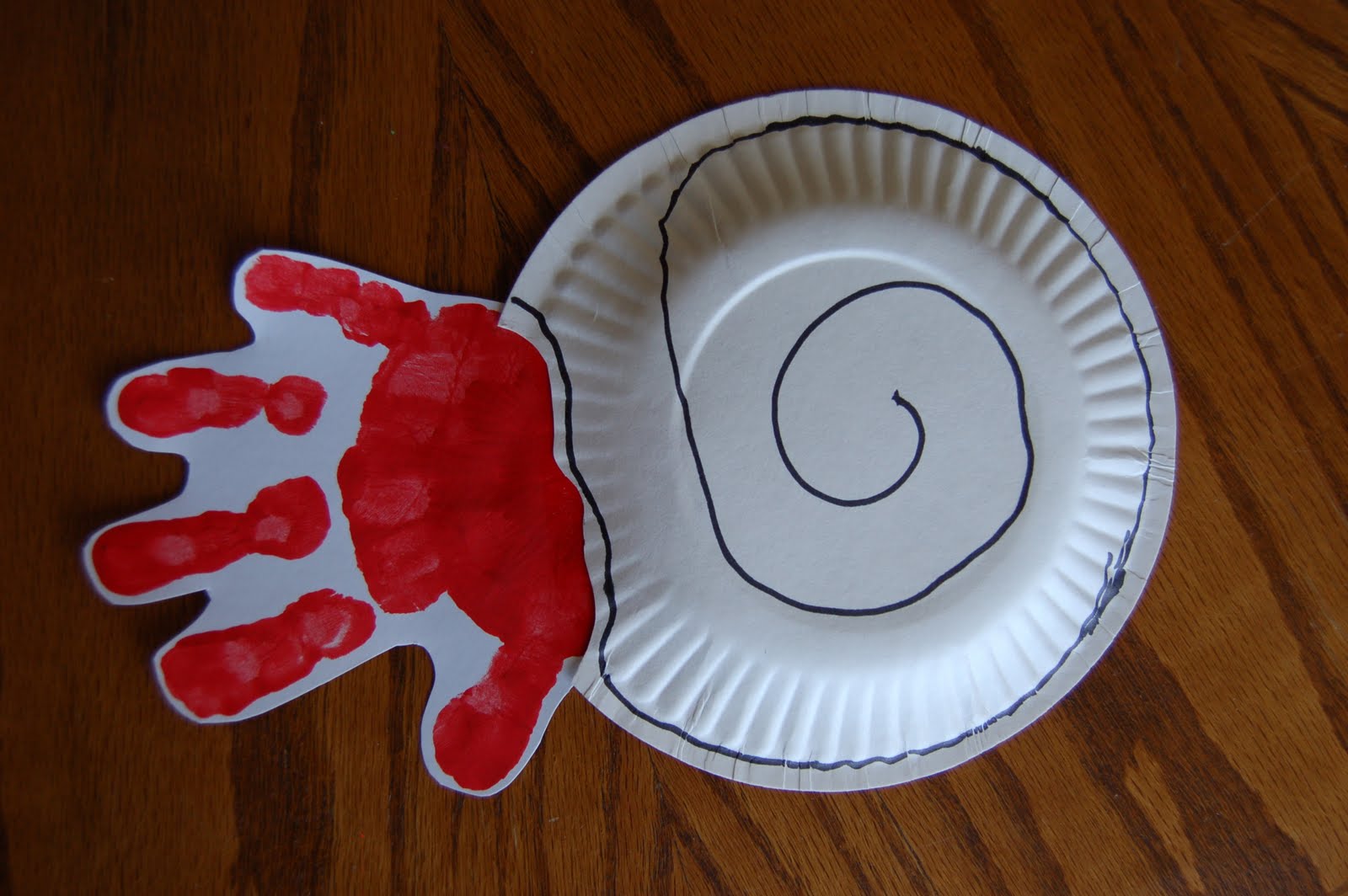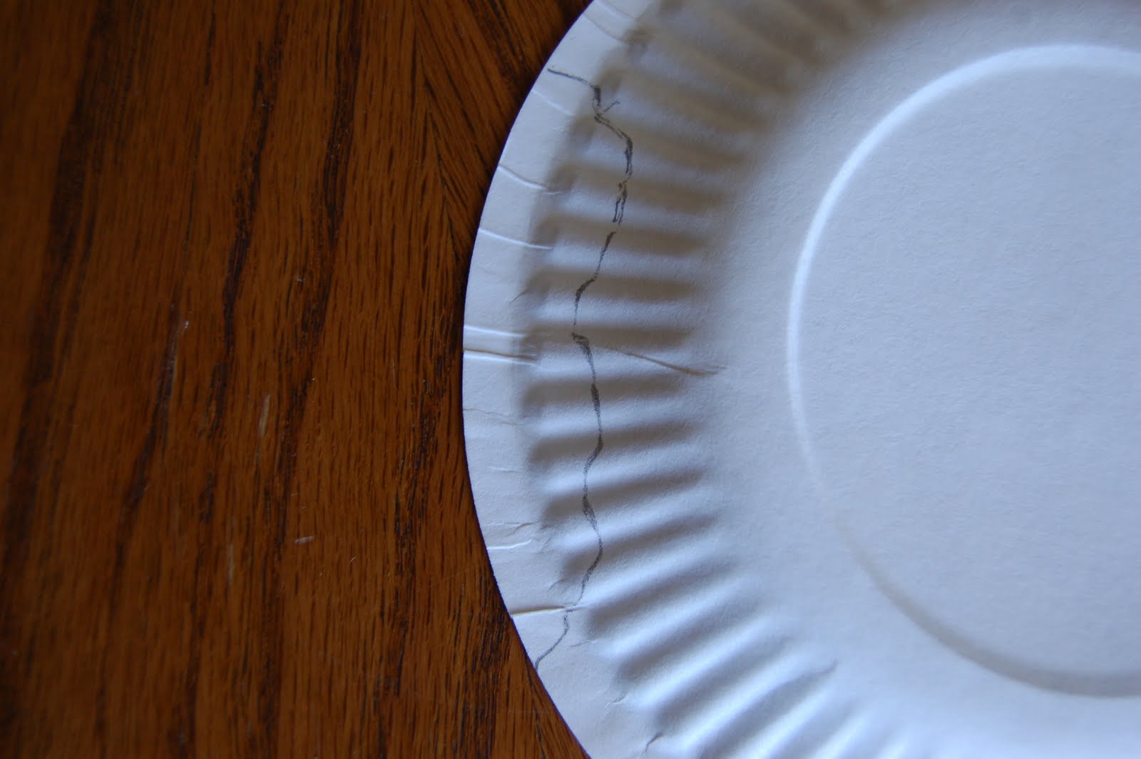 3. For the shell we used one of those small paper plates. I didn’t have any on hand so ended up buying a package at Wal-Mart for $1.88. I’m sure we’ll use them for other crafts so I didn’t mind. Turn the paper right side up (the side you eat on) and on the left edge draw a squiggly line for the opening of the crabs shell. Cut it out, then turn it over.