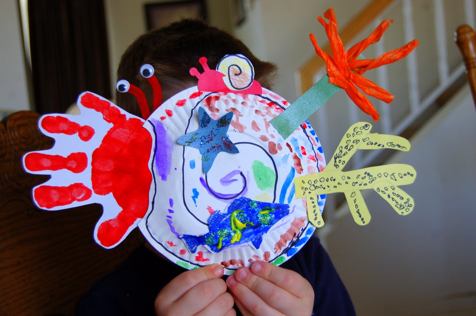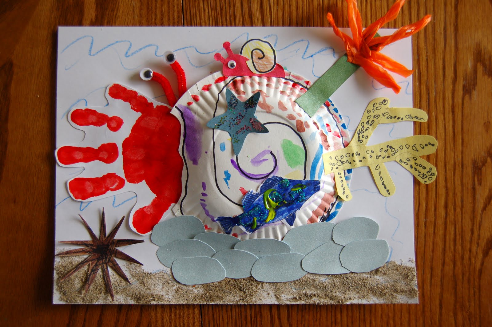 A couple weeks ago I saw THIS hermit crab made out of a hand print and a paper plate. I pinned it immediately and knew it was exactly what I was looking for to go along with this story. When we started making our craft we decided we wanted to re-create our favorite scene in the book. Behold, our Eric Carle masterpiece….