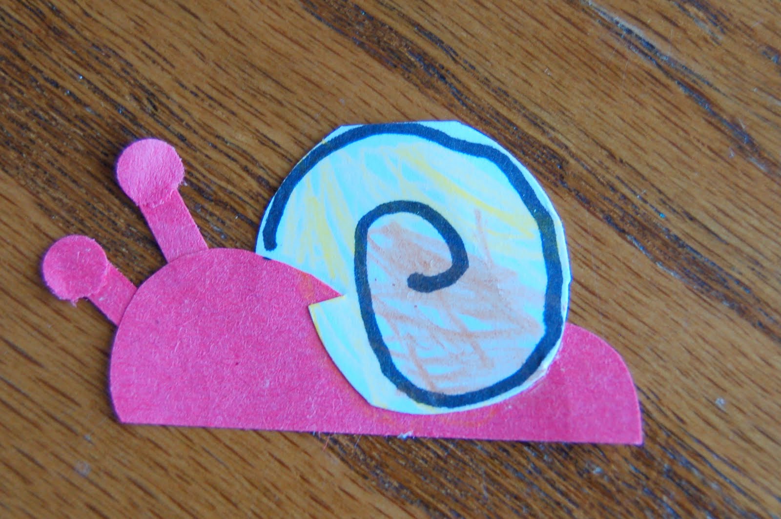 After taking this picture we decided to add a small wiggly eye to him so make sure you do that. I simply just cut the pieces of out construction paper to make him, cut a slit in my white circle to attach him to the snail and put glue on the back to stick the two pieces together. Oh, I used a hole punch to get the circles on the ends of his antennae. Then I used a black marker to draw the shell lines and my son colored his shell with colored pencils.