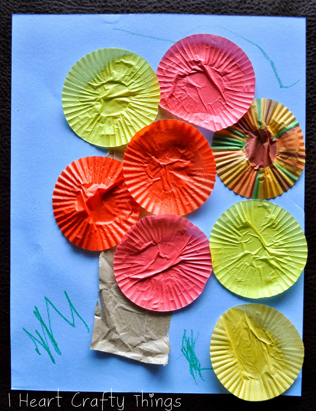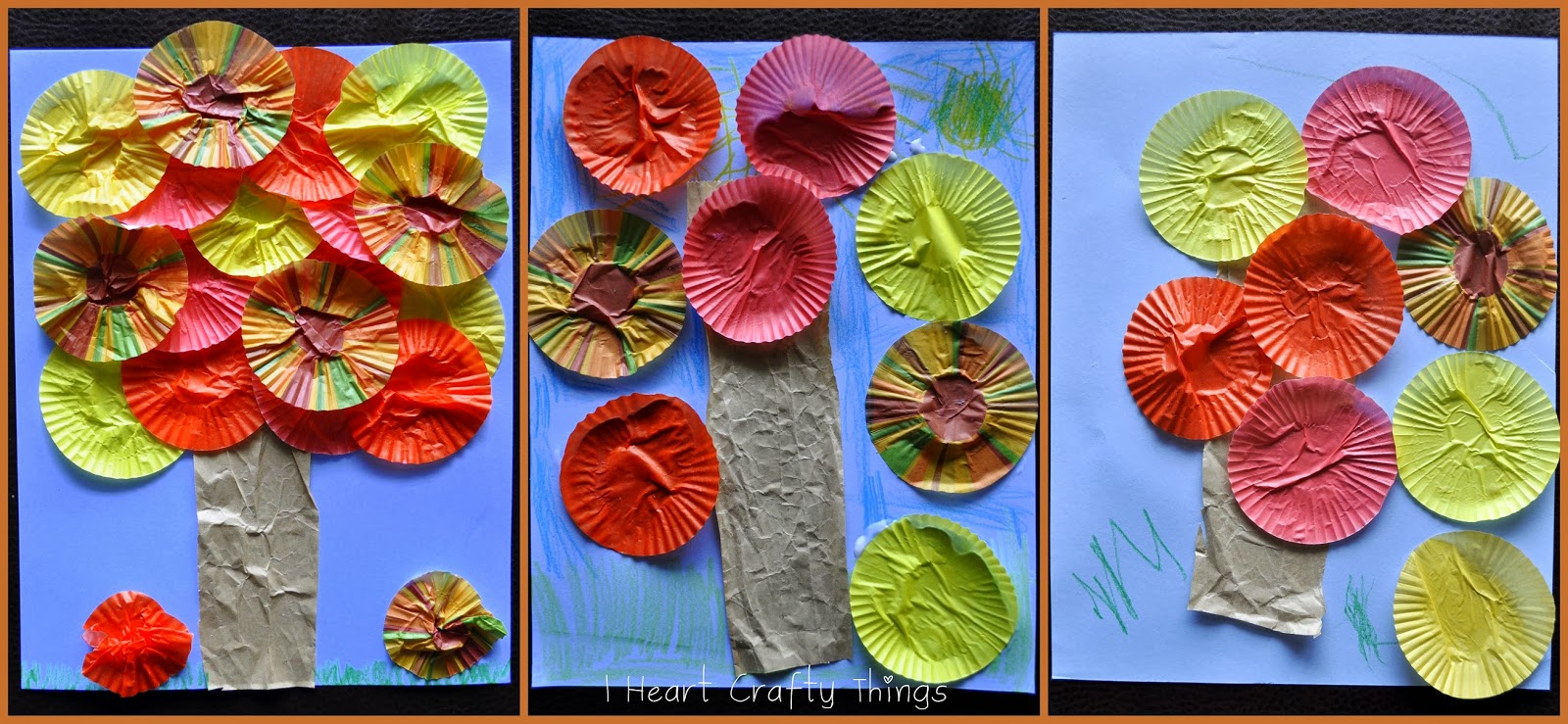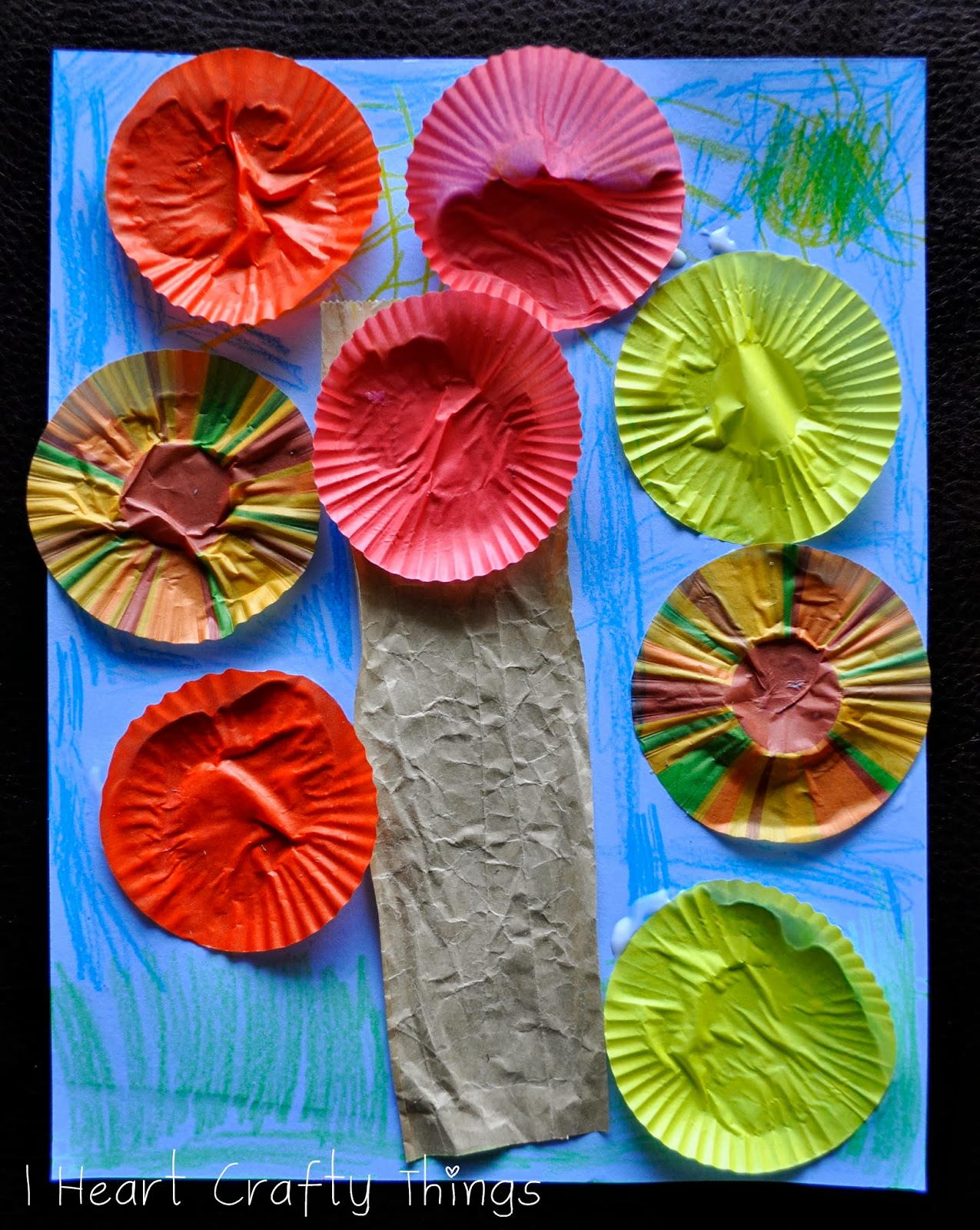 1. Cut a strip out of a your brown lunch sack to use as the trunk. Crinkle it up a bit and then flatten it out and glue it onto your blue cardstock paper.2. Flatten out your mini cupcake liners and glue them onto your paper to make your leaves.