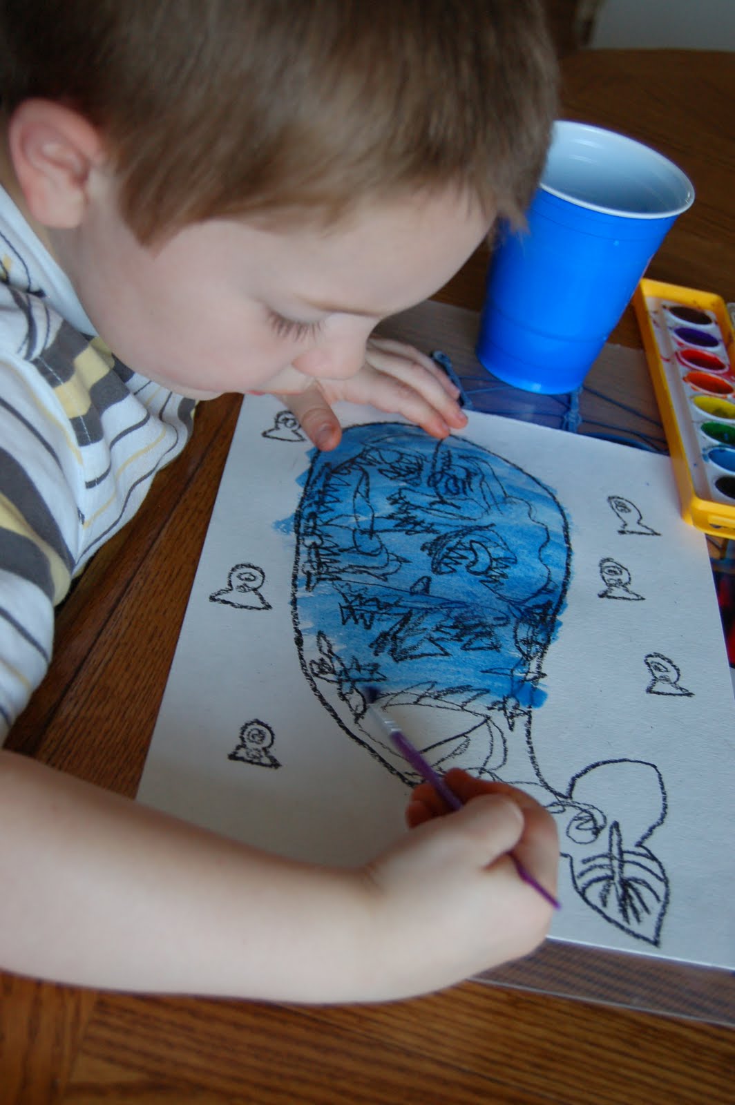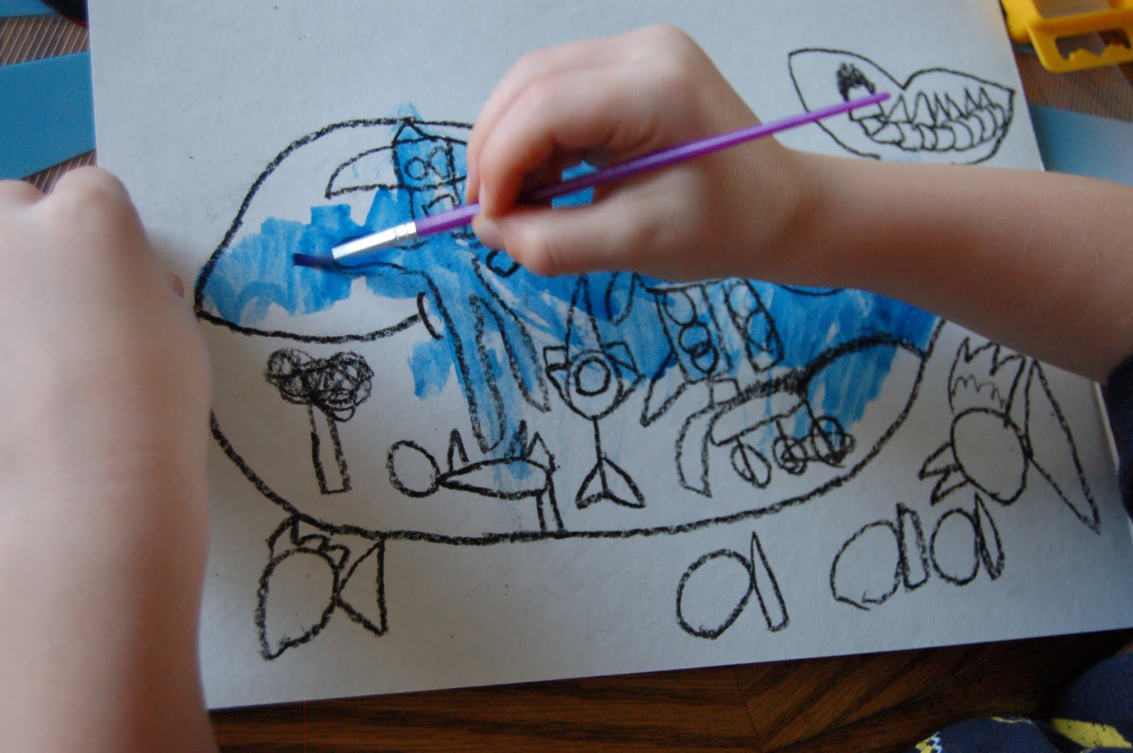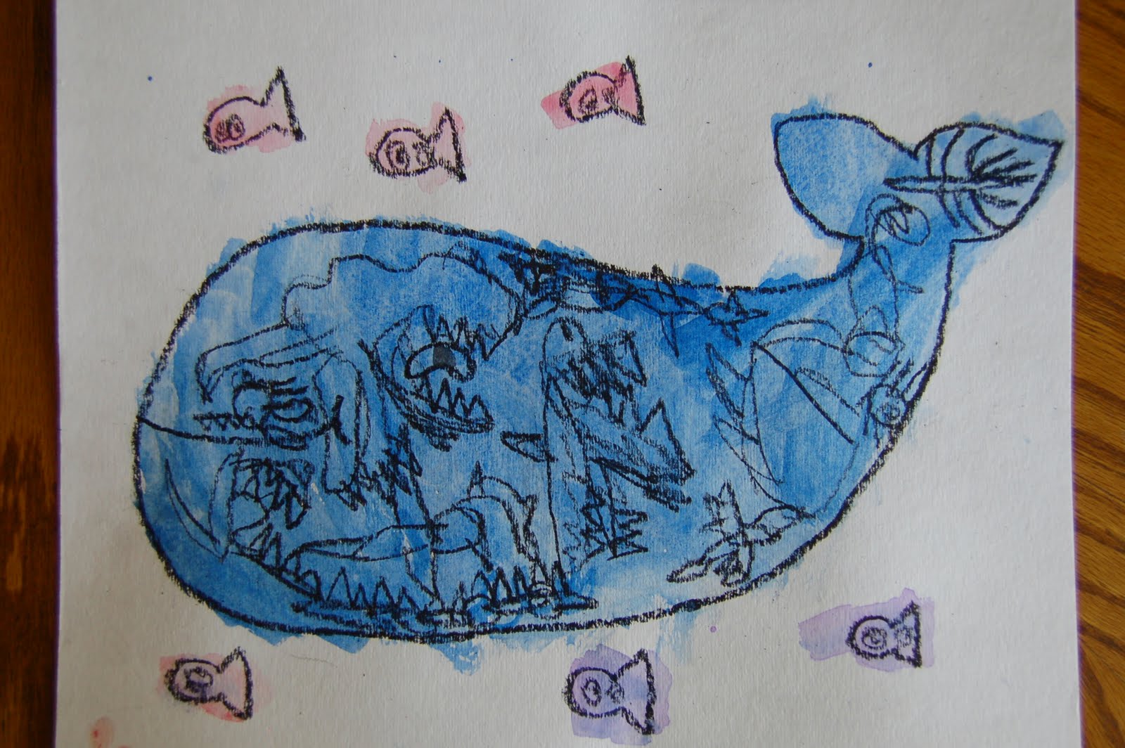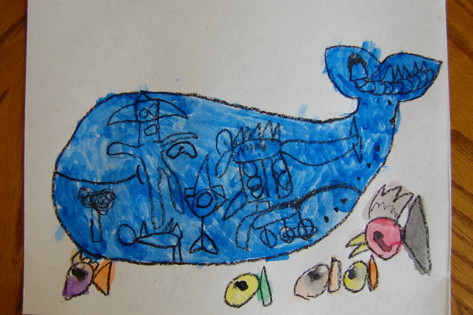 Then the boys used a black crayon to draw pictures on their whale. We also drew some smaller fish around the whale just to add more to the picture.