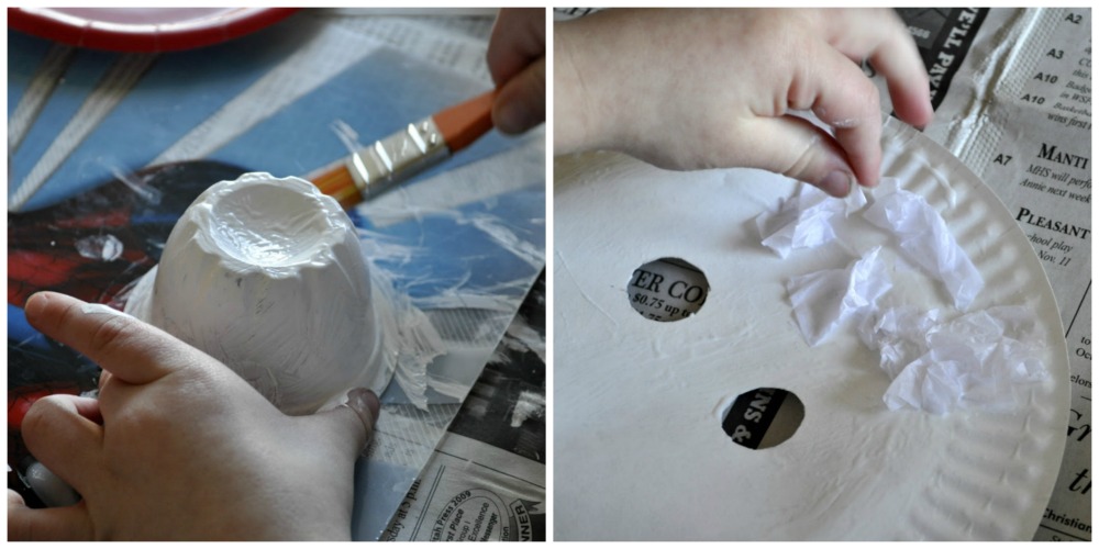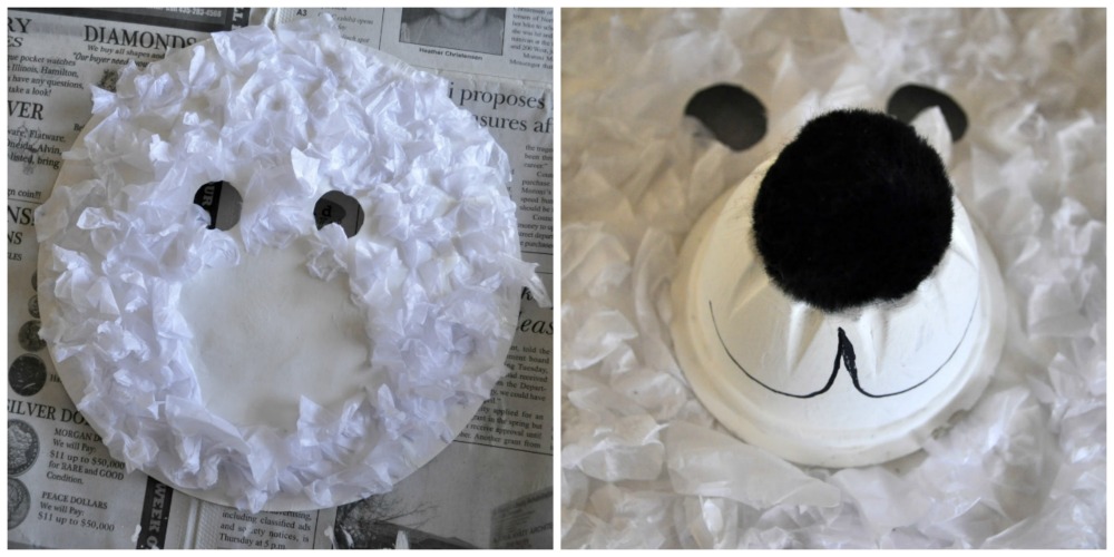 4. While the snout was drying, we put school glue onto a section of our paper plate and then placed white crumpled tissue paper squares all over the glue. Do this on every section until the paper plate is covered. We opted to not put tissue paper where the snout was going to go, but I don’t think it matters which way you do it.