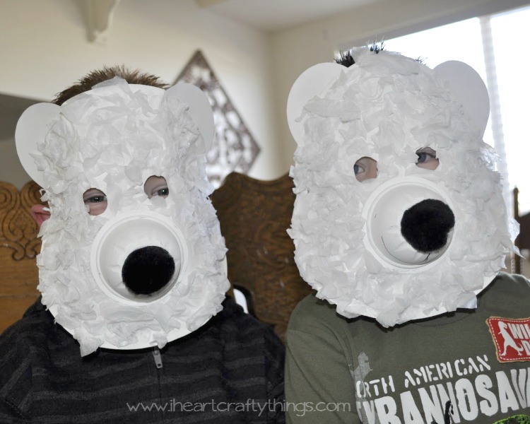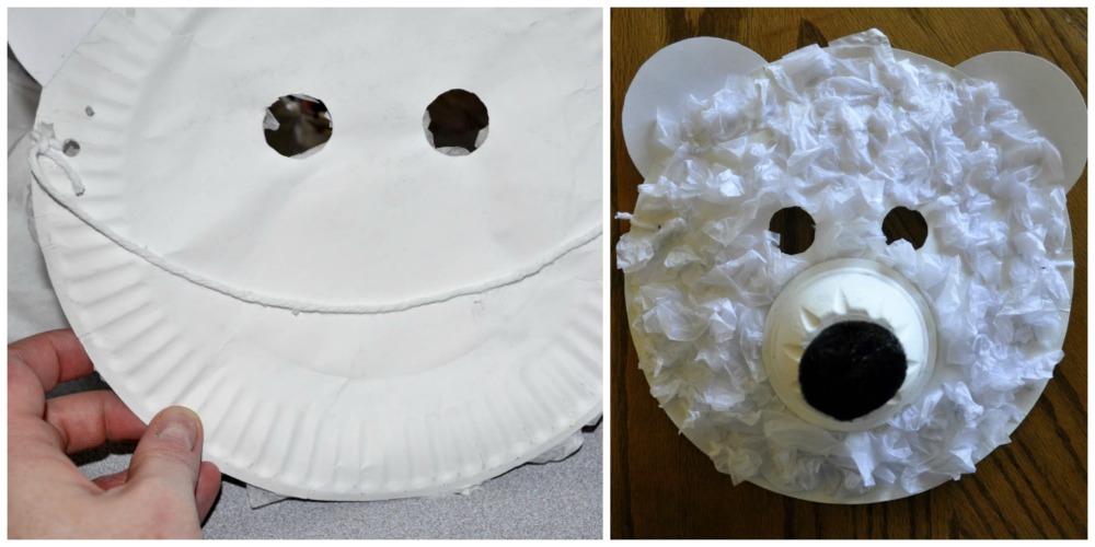 8. To finish the mask, simply punch holes onto the sides of the paper plate and tie a knot on each end with a piece of string or yarn. They turned out so cute and my boys gave them a thumbs up!