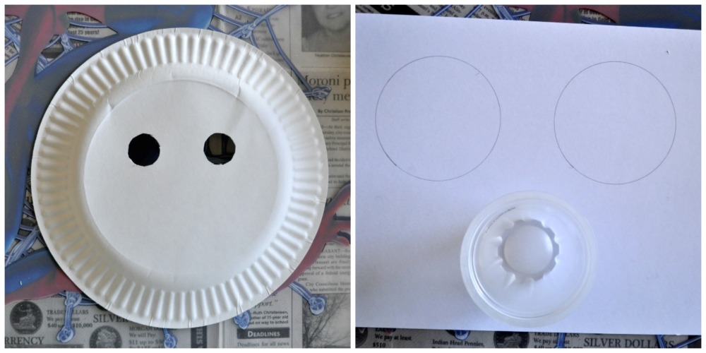 2. For the snout we used an empty plastic fruit cup. I also used it to make the ears by tracing it onto a piece of white card stock paper, cutting it out and then cutting the circle in half. This makes the two ears.