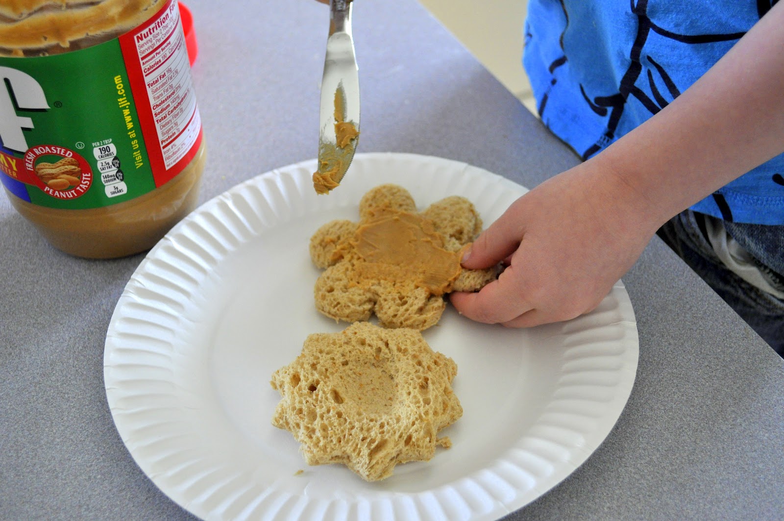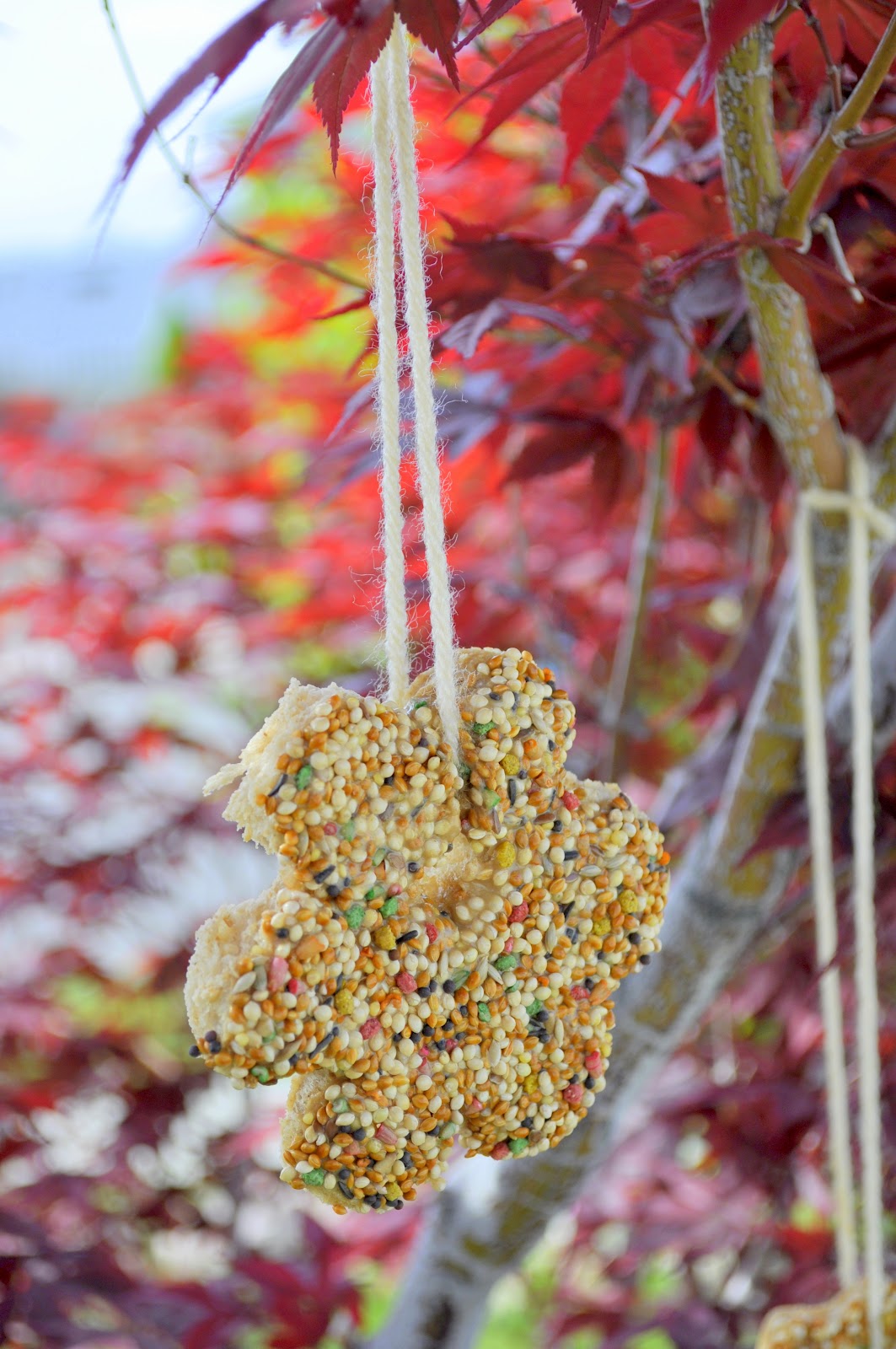 To make them we picked out a couple cookie cutter shapes and my son pressed them into a slice of bread. Then he spread peanut butter all over one side of the shape. Next we poured some bird seed in a shallow dish and my son pressed the shape down into the bird seed, covering the peanut butter completely.