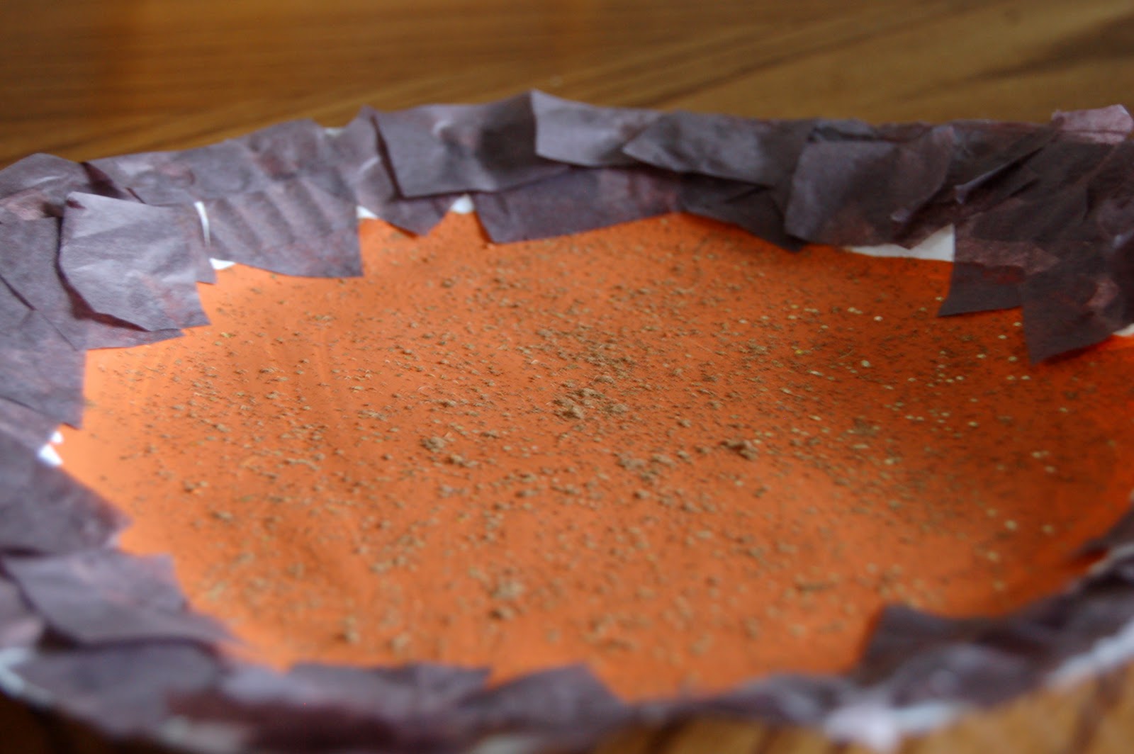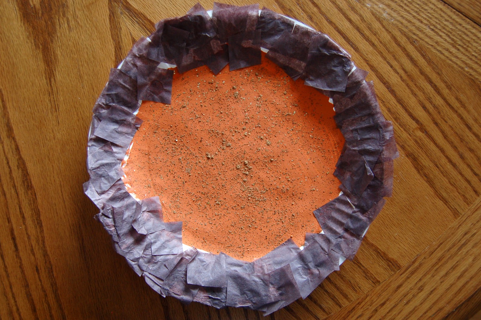 After the paint was dry, we glued square pieces of brown tissue paper around the outside edge of the paper plate to create the crust. You wouldn’t even know it was fake because with the pumpkin pie spice sprinkled on, it smells like the real thing!